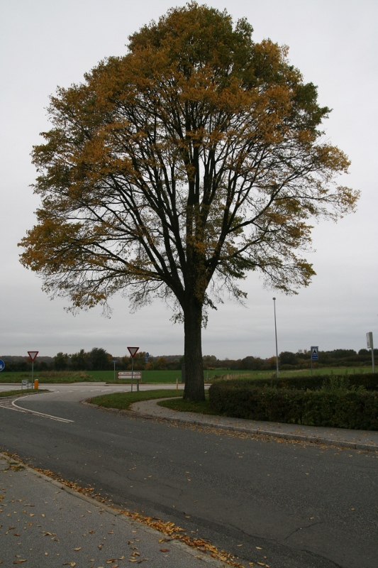Smalbladet elm på hjørnet af Færgevej og Gammelbrovej i Årøsund fotograferet 21. oktober 2012 i efterårets farver. Træet måler 2,68 cm i omkreds og er i god vækst.
