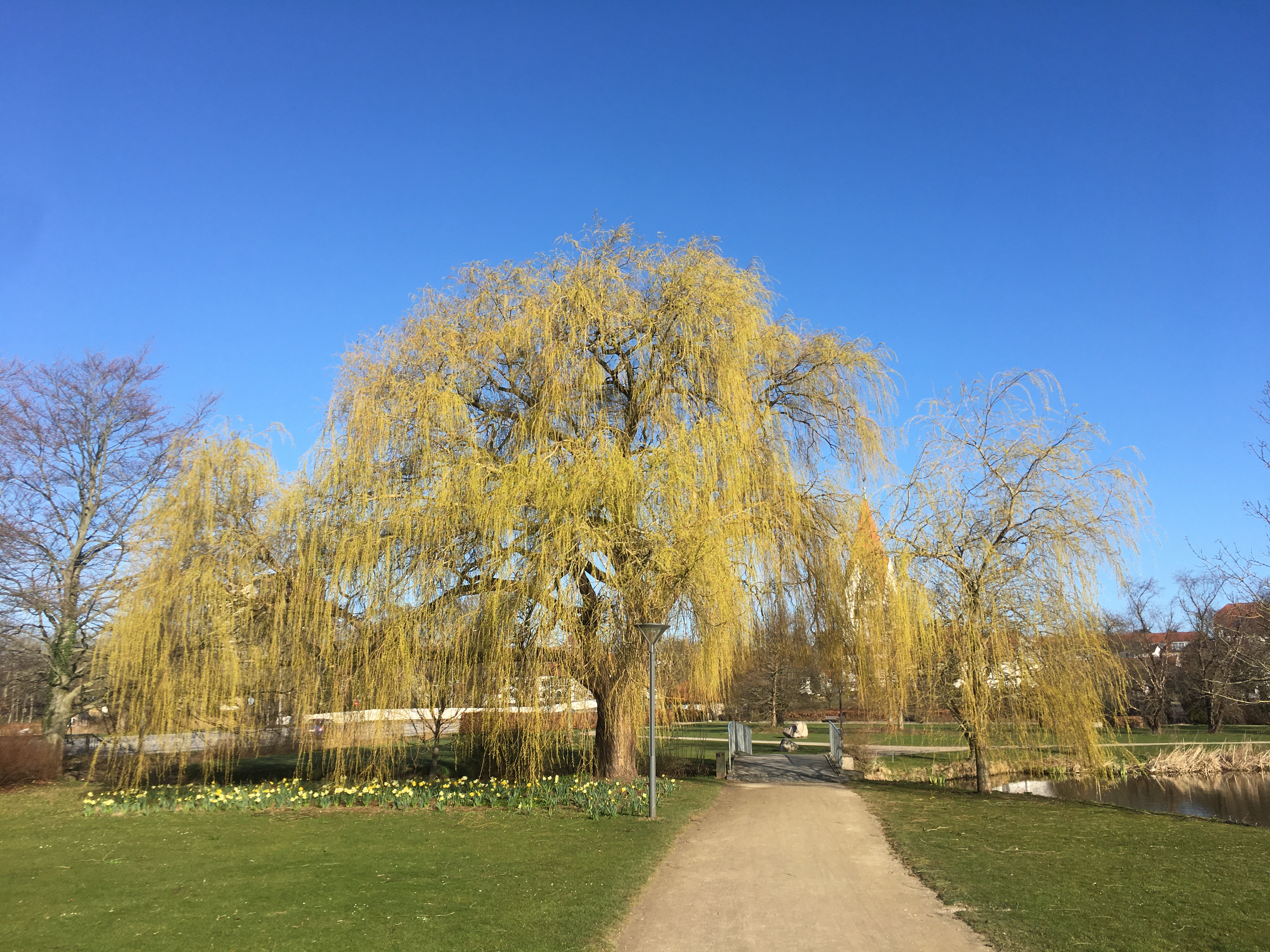 Hængepil i indre dampark. Læg mærke til det lille piletræ til højre (erstatningstræ), som vil vokse sig stor og om mange år erstatte den store pil.